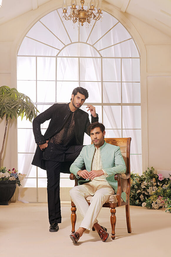 Mint Green color open Prince Coat with Beautiful Silver and Gold handwork on sleeves and on front of Prince Coat
