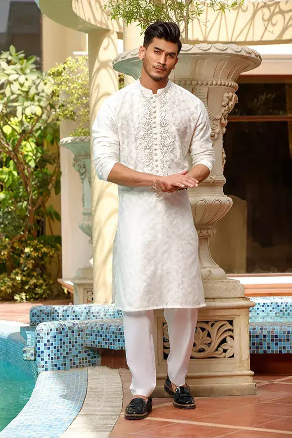 Cream colored fully embroidered Kurta & Raw Silk trouser. Package includes: Kurta Trouser