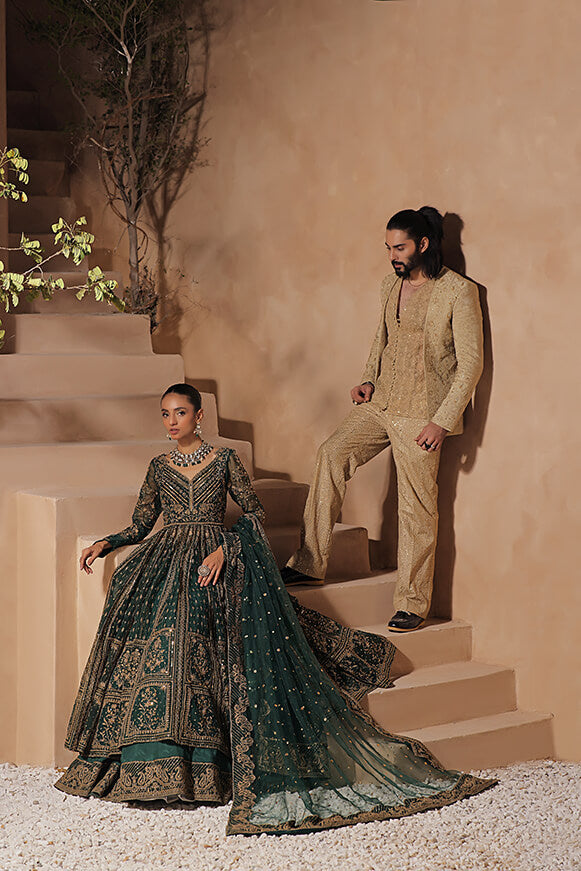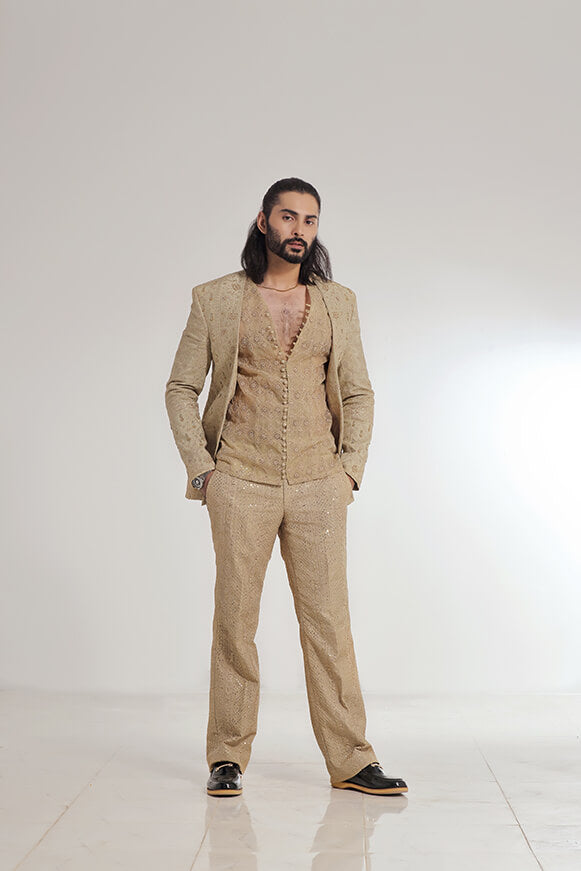 A royal gold and fawn color 3 pieces fusion article with heavy embroidered coat and pants with the element of