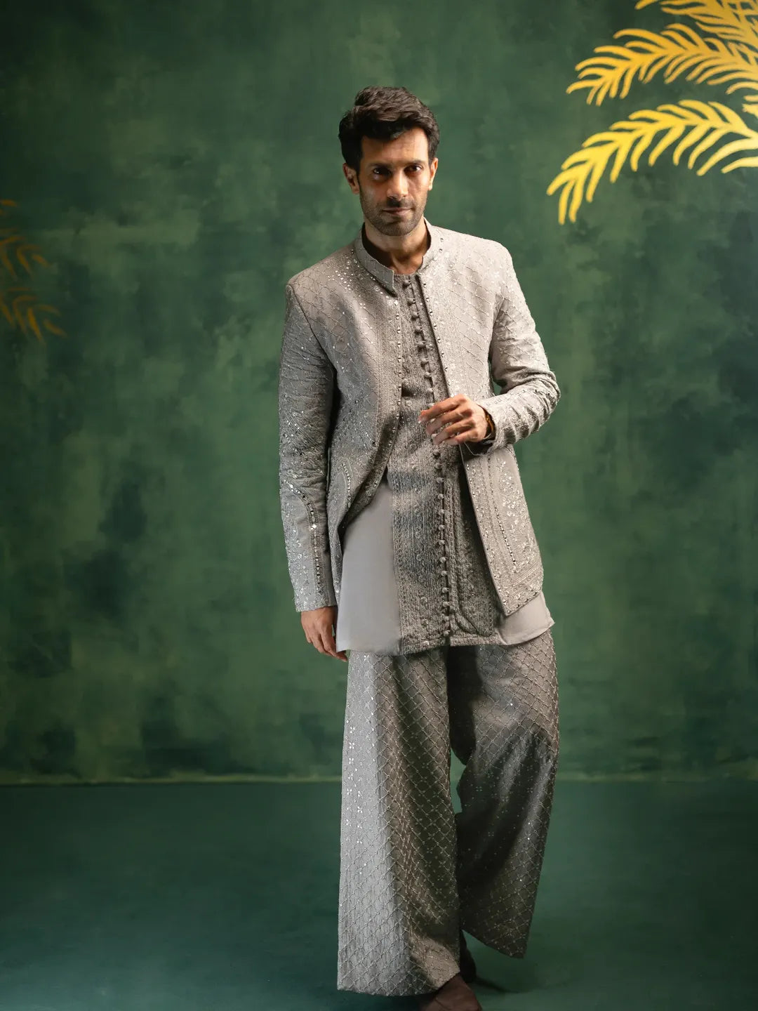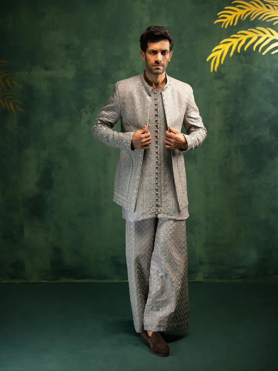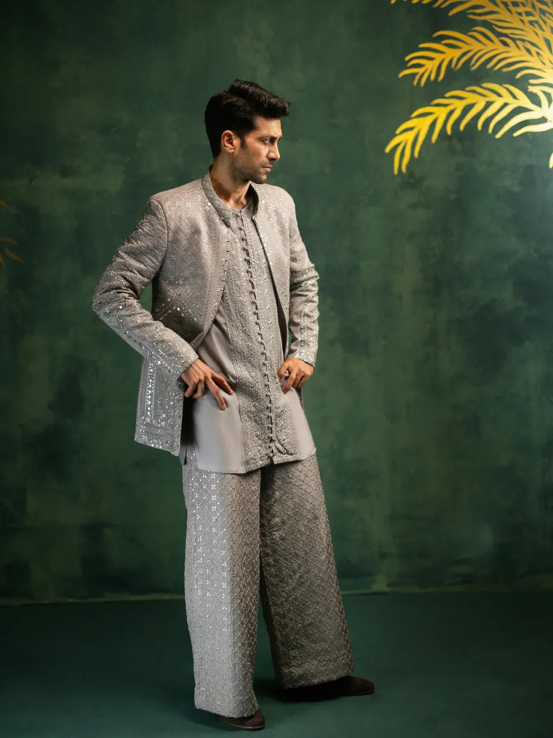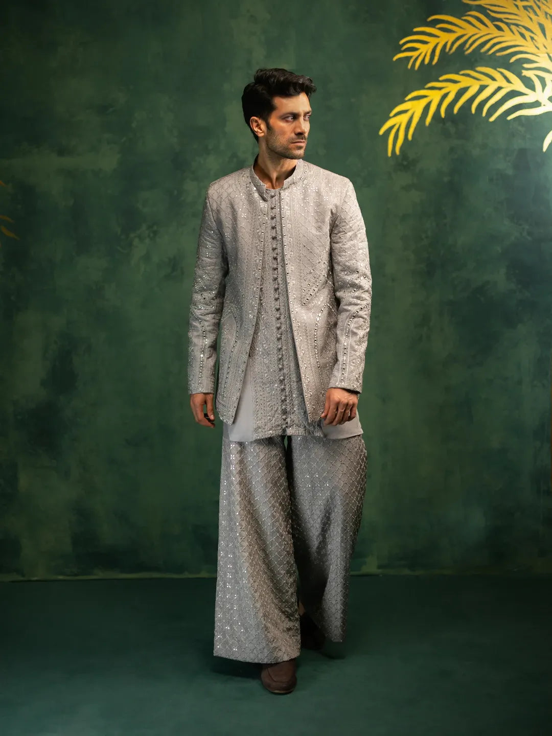 The Zaib is a modern interpretation of regal sophistication. Crafted in an ash-grey hue, the prince coat is fully embroidered with meticulous resham work and tikki stones, enhancing its texture and presence. This statement piece balances traditional craftsmanship with contemporary tailoring. Paired with a silk kurta and loose embroidered pants, the ensemble creates an effortlessly refined silhouette for formal occasions.
