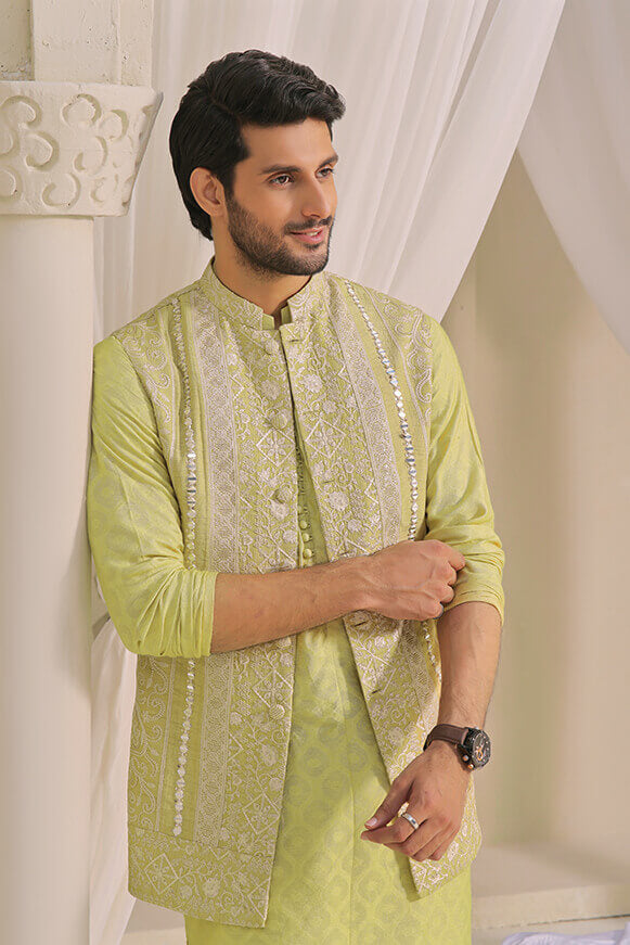A beautiful color of this season long waist coat fully embroidered with Ivory and Gold thread work and details of