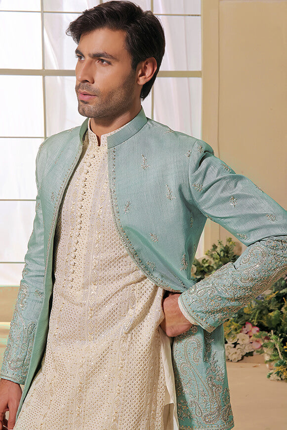 Mint Green color open Prince Coat with Beautiful Silver and Gold handwork on sleeves and on front of Prince Coat.